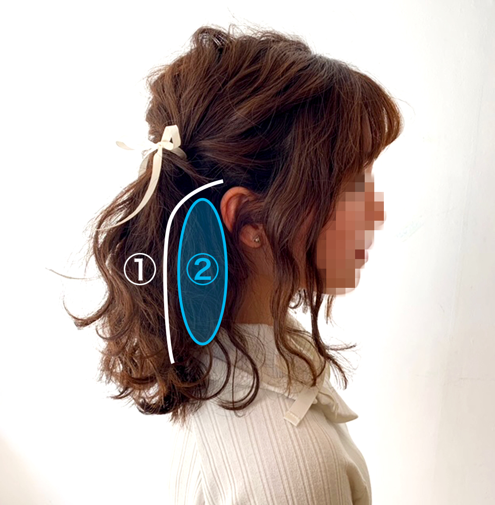 こちらあえてお伝えするならばやはりボリュームを抑えるため、水色②に髪をまとめてボリュームを減らし、①をかぶせるとより収まりがいいアレンジになるかと思います! また2つ目のアレンジは1つ目のアレンジのようなタイトにボリュームをなくすだけでなく波波アレンジとの自然同化も大切なため軽く編み込んでからまとめると被せる髪や内側の髪と馴染み良いと思います!